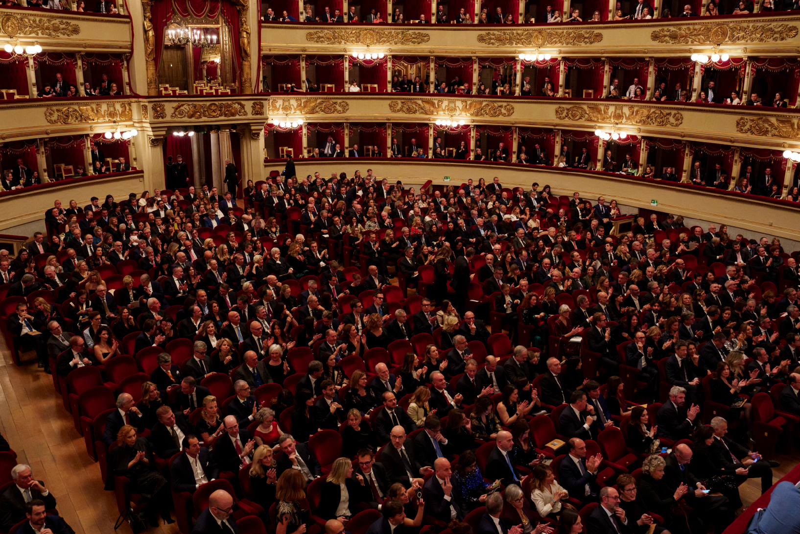 La serata si apre con un raffinato aperitivo nel foyer, seguito da uno speech istituzionale sul prestigioso palco del teatro e un’esibizione straordinaria dell’orchestra della Scala.
